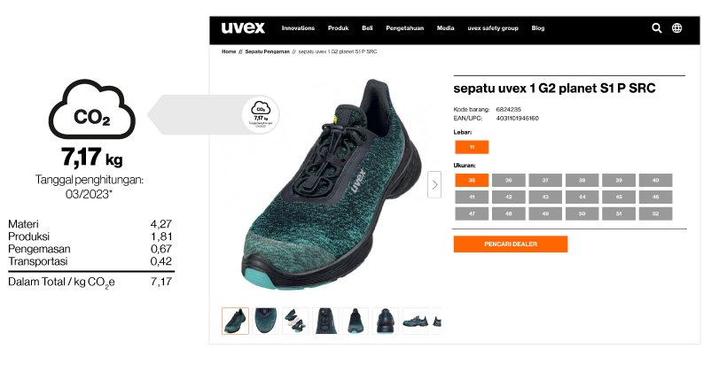 Untuk verifikasi independen atas metode pengukuran dan penghitungan jejak CO2 yang sesuai, kami menyiapkan laporan penghitungan sepatu pengaman uvex 1 G2 planet. Metode ini dilakukan sesuai dengan ISO 14067 dan laporan tersebut telah berhasil lulus audit kepatuhan. Kami memilih sepatu pengaman untuk pengujian karena sepatu pengaman ini adalah produk kami yang paling komprehensif dan kompleks. Semua produk dihitung dengan cara yang sama seperti dalam metode ini.